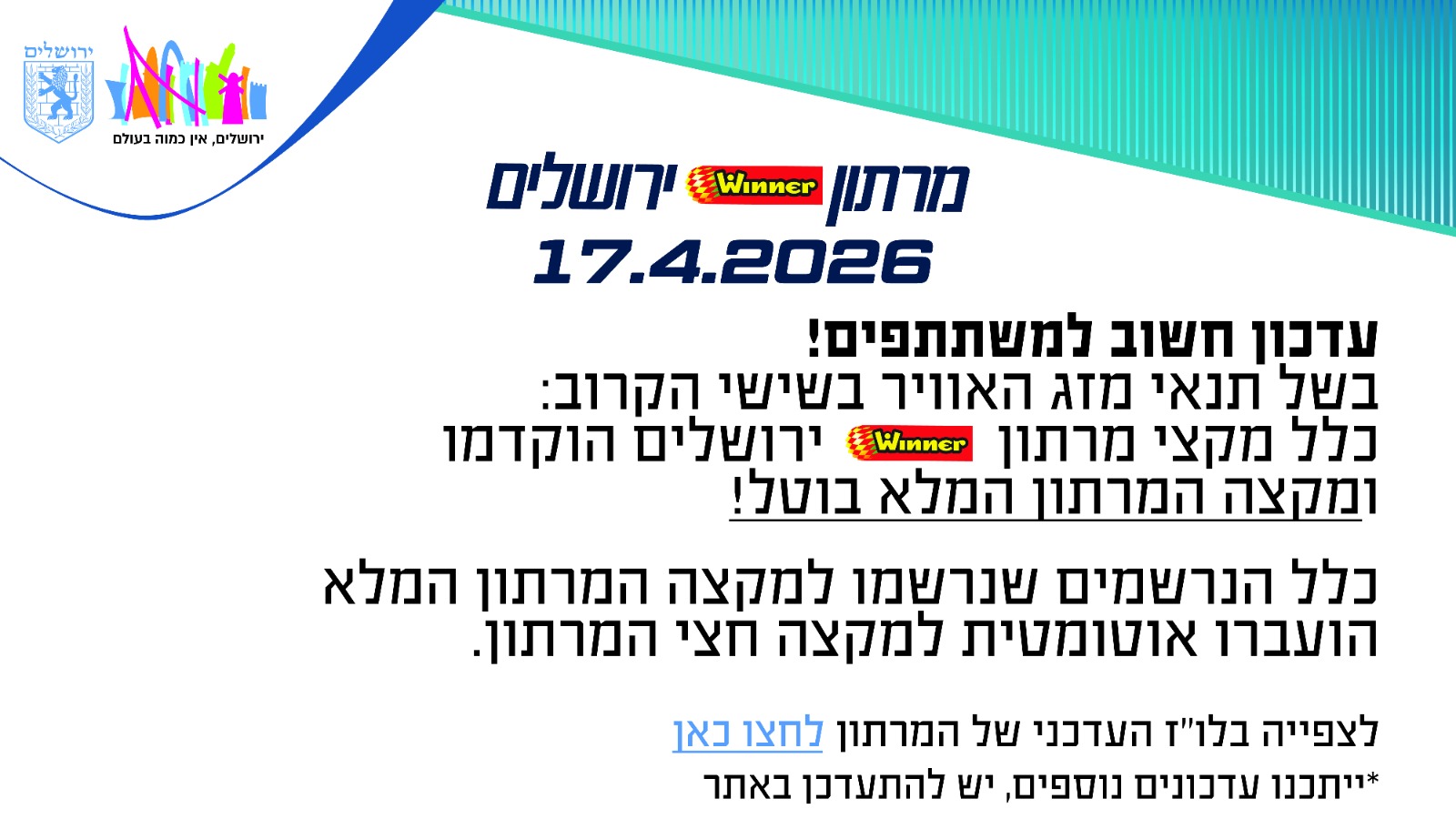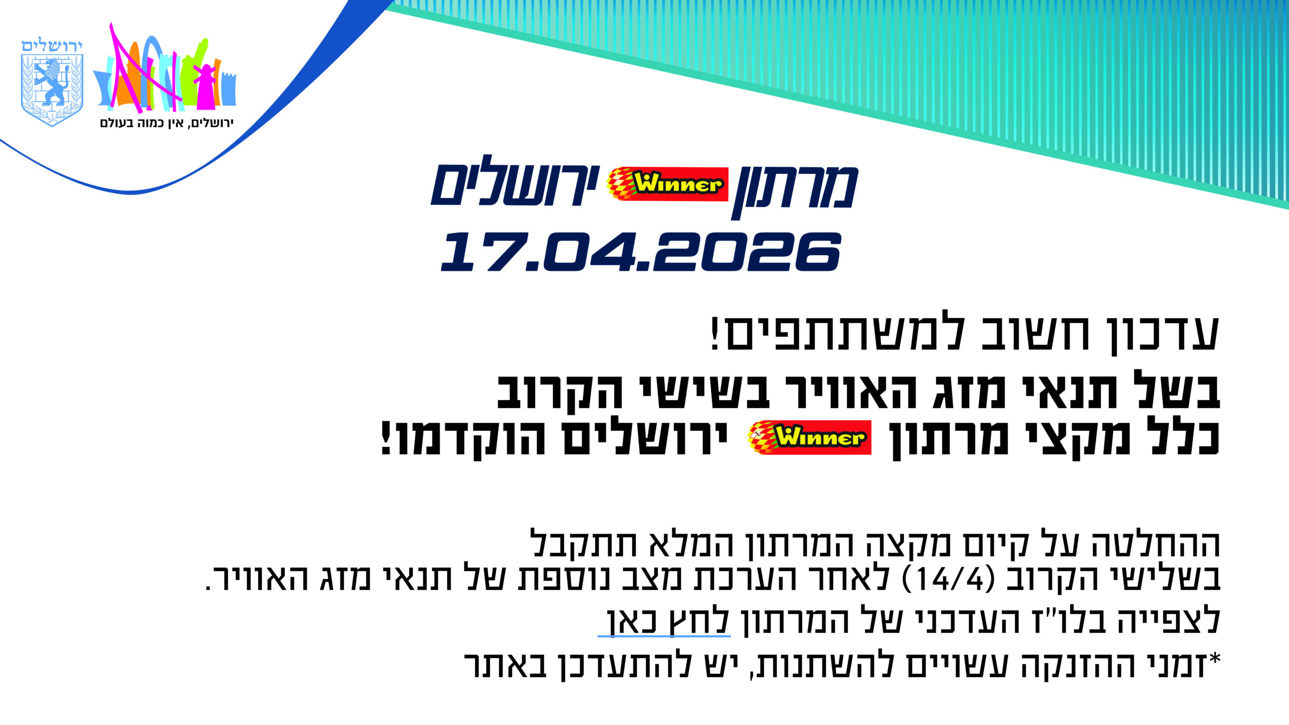 7 טיפים למשתתפי מרתון Winner ירושלים מהמומחים של מכללת רידמןהפתרון הטבעי לנזק שרירירצים מרתון? כל מה שרציתם לדעת על פחמימות ומאגרי הגליקוגן בגוףהערך המוסף של בדיקת המאמץ המורחבת בשיפור הכושר האירובי ובהפחתת משקלמדריך התזונה המלא לקראת מרתון ירושלים