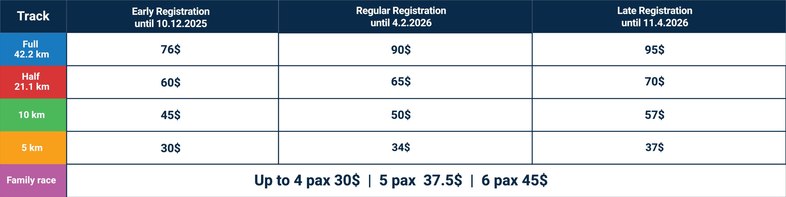 | Full 42.2 km | 76$ | 90$ | 95$ |