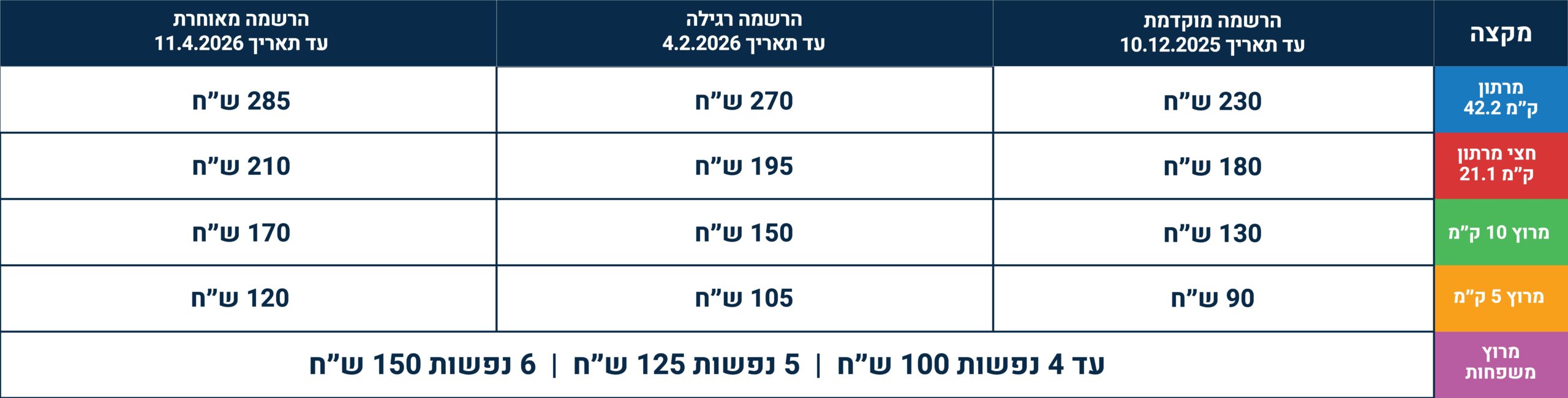 | מקצה | הרשמה מוקדמת עד תאריך 10.12.2025 | השמה רגילה עד תאריך 04.2.2026 | הרשמה מאוחרת עד תאריך 21.3.2026 |