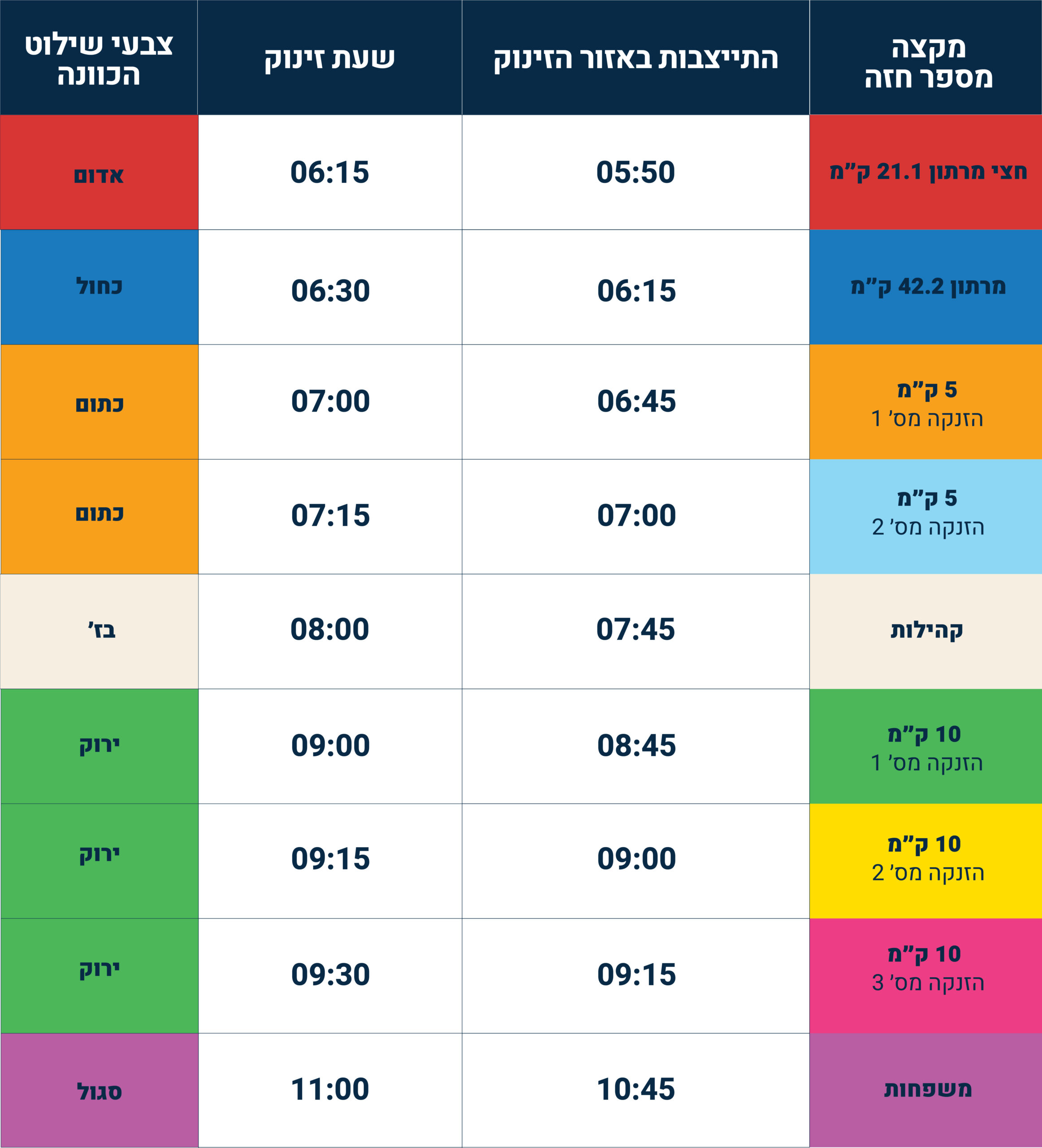 | חצי מרתון 21.1 ק״מ | 05:50 | 06:15 | אדום |