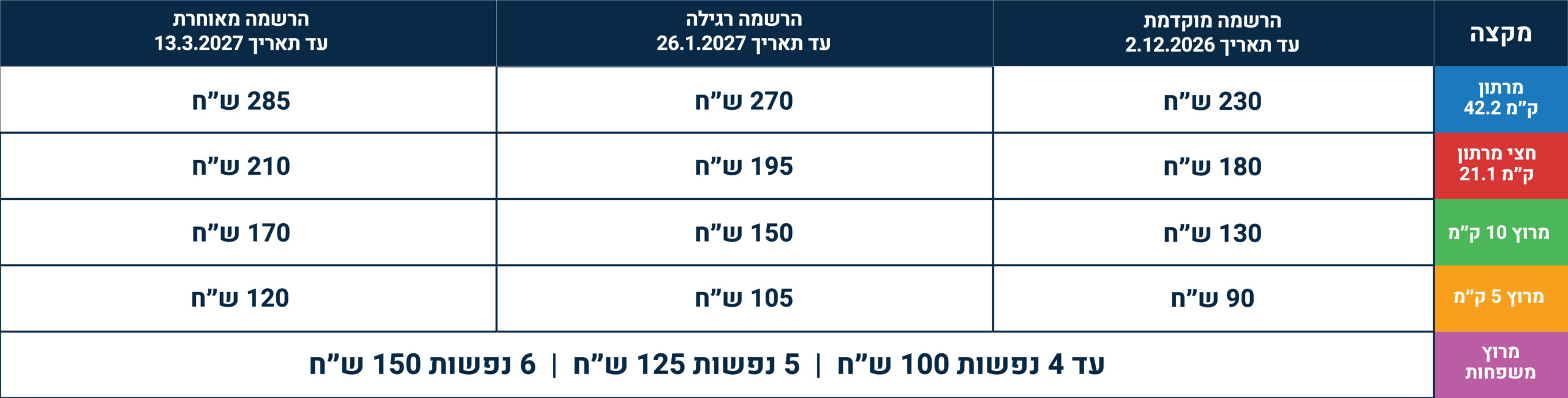 | מרתון- 42.2 ק"מ | 230 ש"ח | 270 ש"ח | 285 ש"ח |