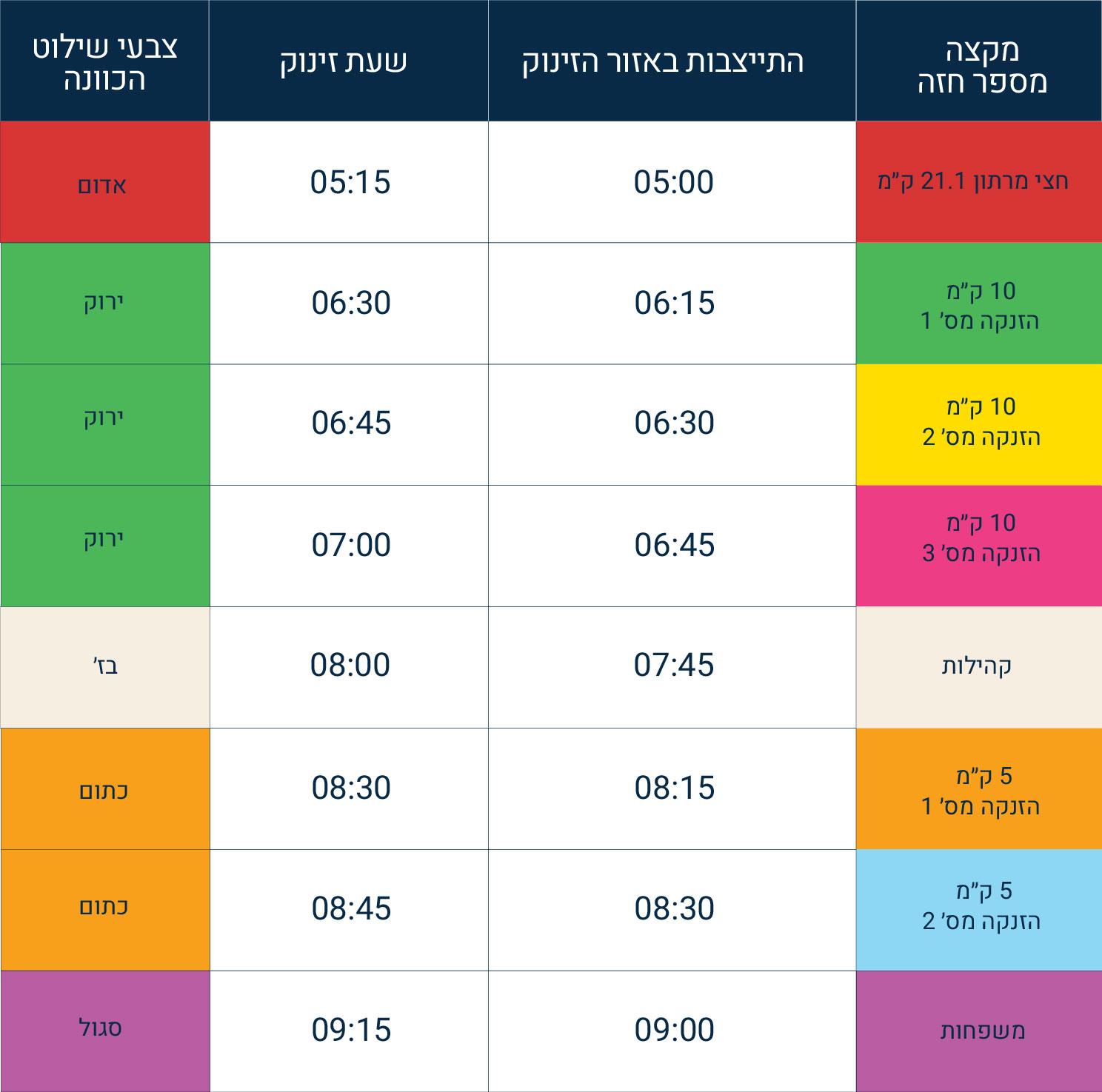| מקצה מספר חזה | התייצבות באזור הזינוק | שעת זינוק | צבעי שילוט הכוונה |