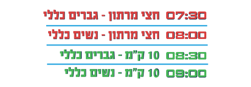 * 5 ק"מ – 10 ומעלה (לנרשמים עד גיל 18 מותנה באישור הורה בעת ביצוע הליך הרישום).19 במרץ 2027
